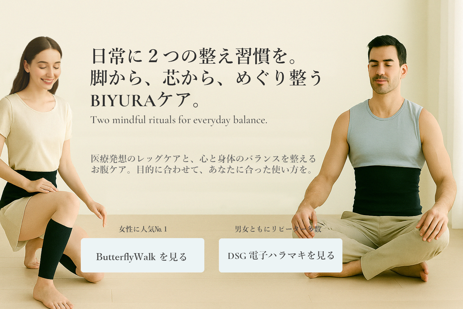 BIYURAの製品は、医療発想の構造と整体師監修の知見を掛け合わせて設計された“まとうセルフケア”プロダクトです。